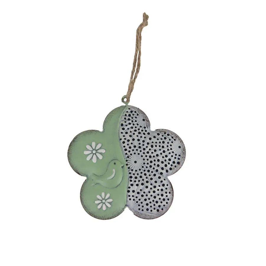 Decorative flower for hanging. Dimensions: diameter 8.5 cm, thickness 1.2 cm. Color: combination green, white. Material: metal.