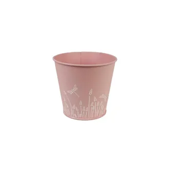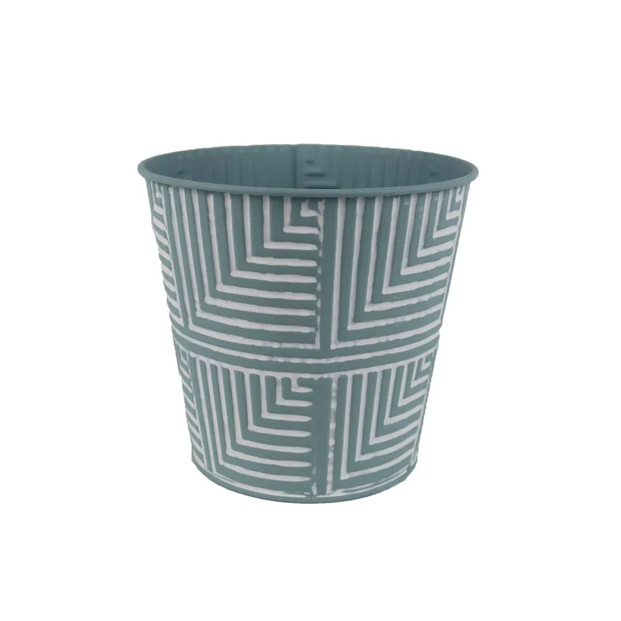 Tin flower pot. Dimensions: diameter 15.5 cm, height 14.6 cm. Color: a combination of green and white. Material: metal.