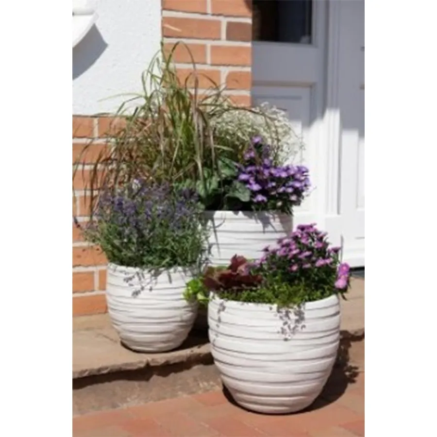 A set of packaging for planting. It is not frost-resistant, hide it for the winter! The set contains 3 dwellings of three sizes. The small package has a diameter of 27 cm and a height of 2.5 cm. The medium package has a diameter of 36 cm, a height of 31.5 cm. The large packaging has a diameter of 46 cm and a height of 39 cm. White color. Material: magnesium.
