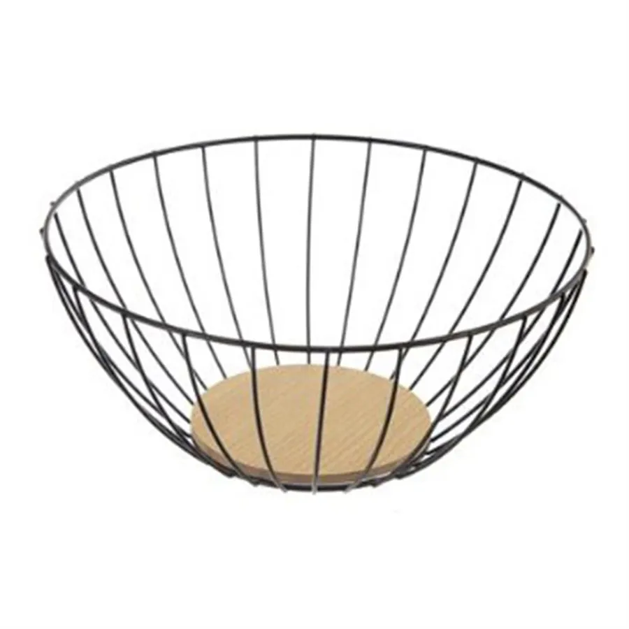 Black metal basket RADKA, equipped with a base made of pine wood, intended for storing fruit and various decorations. It has a diameter of 28 cm and is made of metal that has a black powder coating. The lower part is made of pine wood.