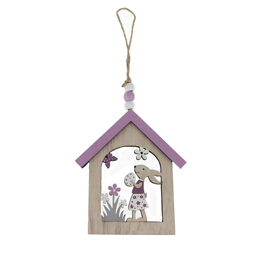 Easter decoration to hang. Dimensions: 11 x 0.5 cm, height 12 cm. Color: combination of natural, white, purple. Wood-based material.