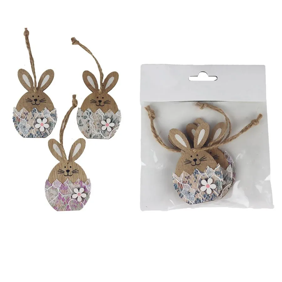 Set of decorative bunnies for hanging. The set contains 3 decorations. Dimensions: 5 x 0.4 cm, height 7.5 cm. Color: natural combination with white, pink, blue. Wood-based material, textile.