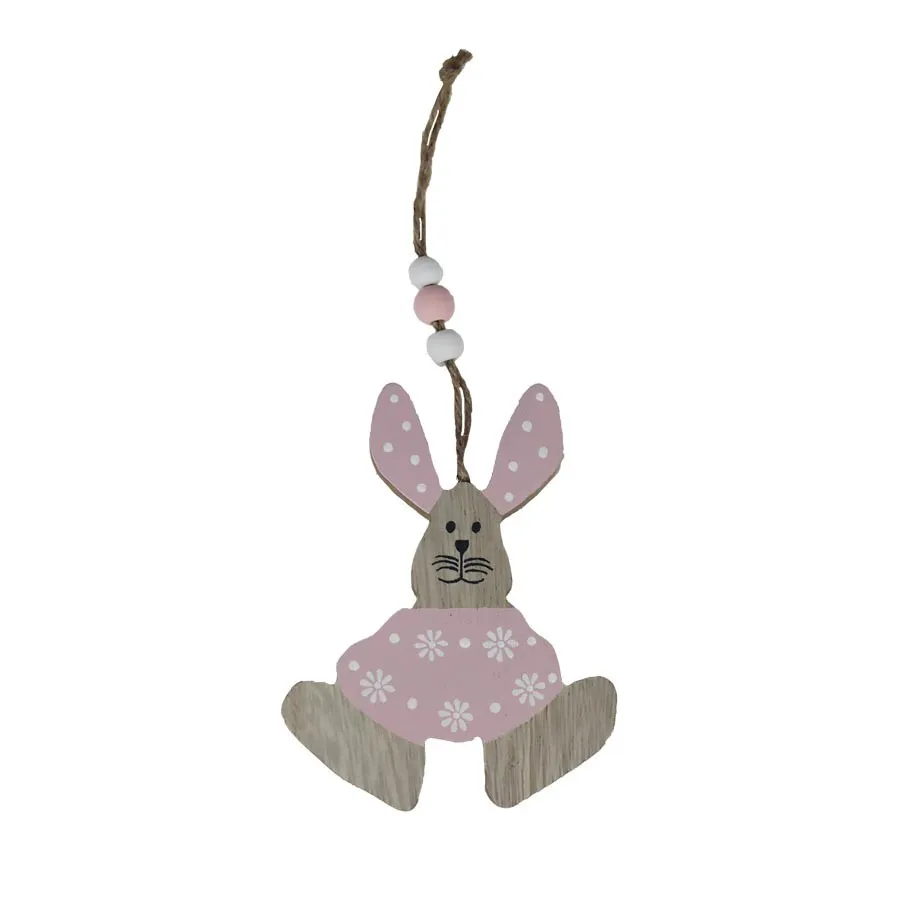 Decorative rabbit for hanging. Dimensions: 9 x 1 cm, height 12 cm, total length 23 cm. Baarva: a combination of natural and pink. Wood-based material.