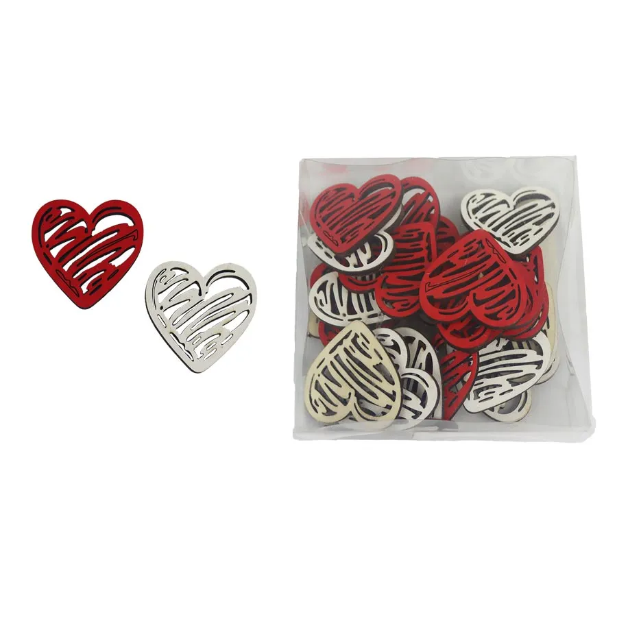 Set of decorative hearts. The set contains 24 hearts. Dimensions: 3.5 x 3.5 cm, thickness 0.3 cm. Color: combination white, red. Wood-based material.