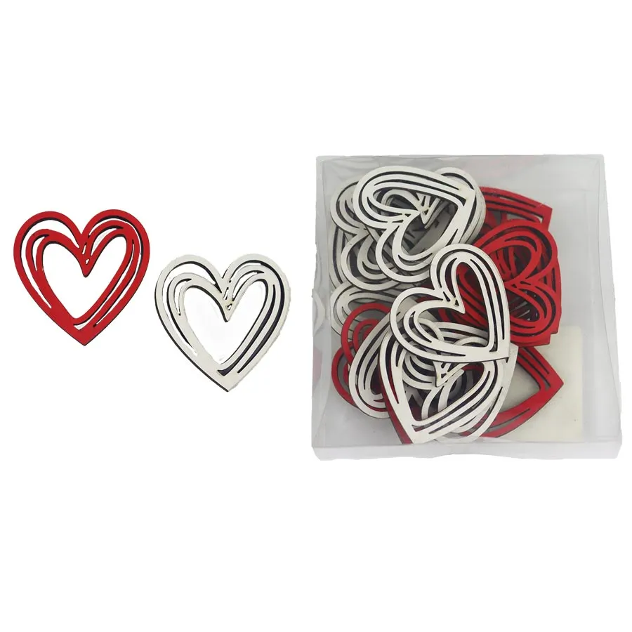 Set of decorative hearts. The set contains 24 hearts. Dimensions: 4 x 3.8 cm, thickness 0.3 cm. Color: combination white, red. Wood-based material.