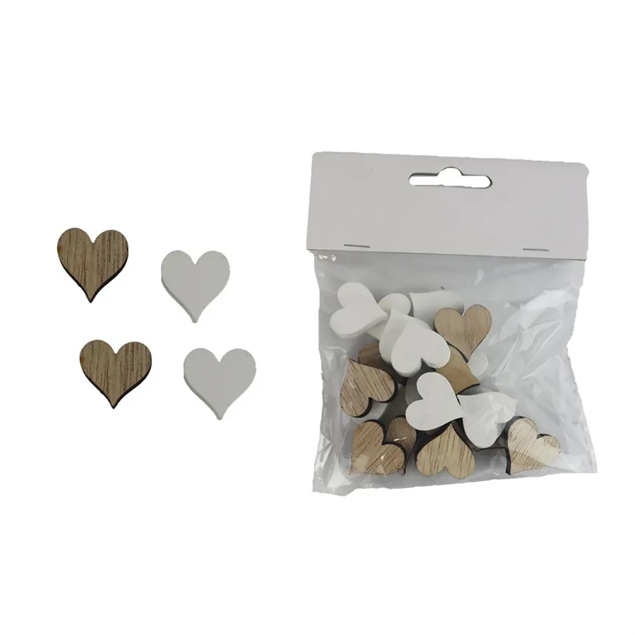 Set of decorative hearts. The set contains 24 hearts. Dimensions: 2 x 2 cm, thickness 0.5 cm. Color: combination natural, white. Wood-based material.