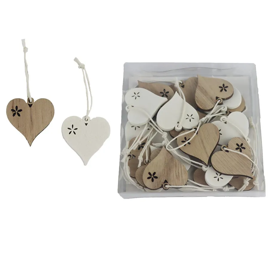 Set of decorative hearts for hanging. The set contains 24 hearts. Dimensions: 3 x 3 cm, thickness 0.3 cm. Color: white, natural combination. Wood-based material.