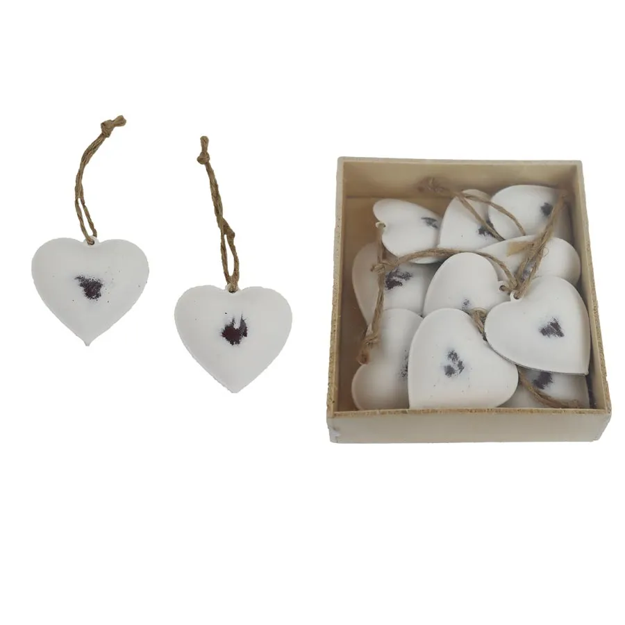 Set of decorative hearts for hanging. Dimensions: 3.7 x 3.7 cm, thickness 1.2 cm. Color: white patina. Material: metal.