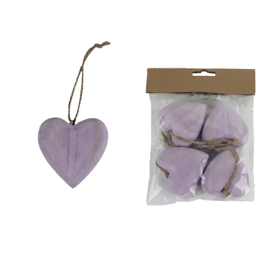 Set of hearts to hang. The set contains 4 hearts. Dimensions: 5.5 x 6 cm, thickness 2.5 cm. Color: purple. Wood-based material.
