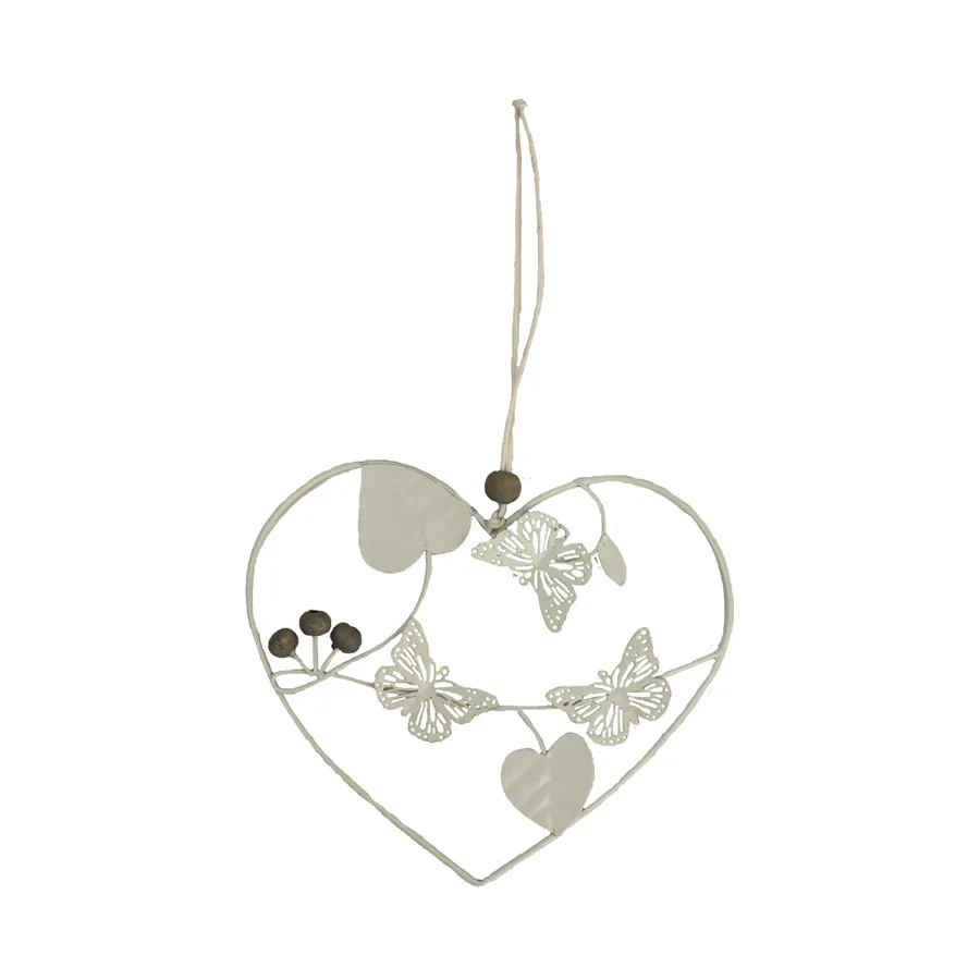 Hanging heart with butterflies. Size: width 12 cm, thickness 0,5 cm, height 10,6 cm. Color: white. Material: metal.