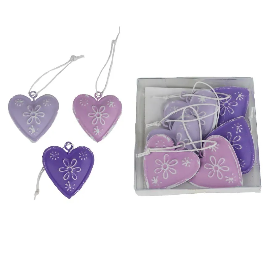Set of decorative hearts for hanging. The set contains 6 hearts. Dimensions: 4 x 4 cm, thickness 0.6 cm. Color: pink, purple combination. Material: metal.