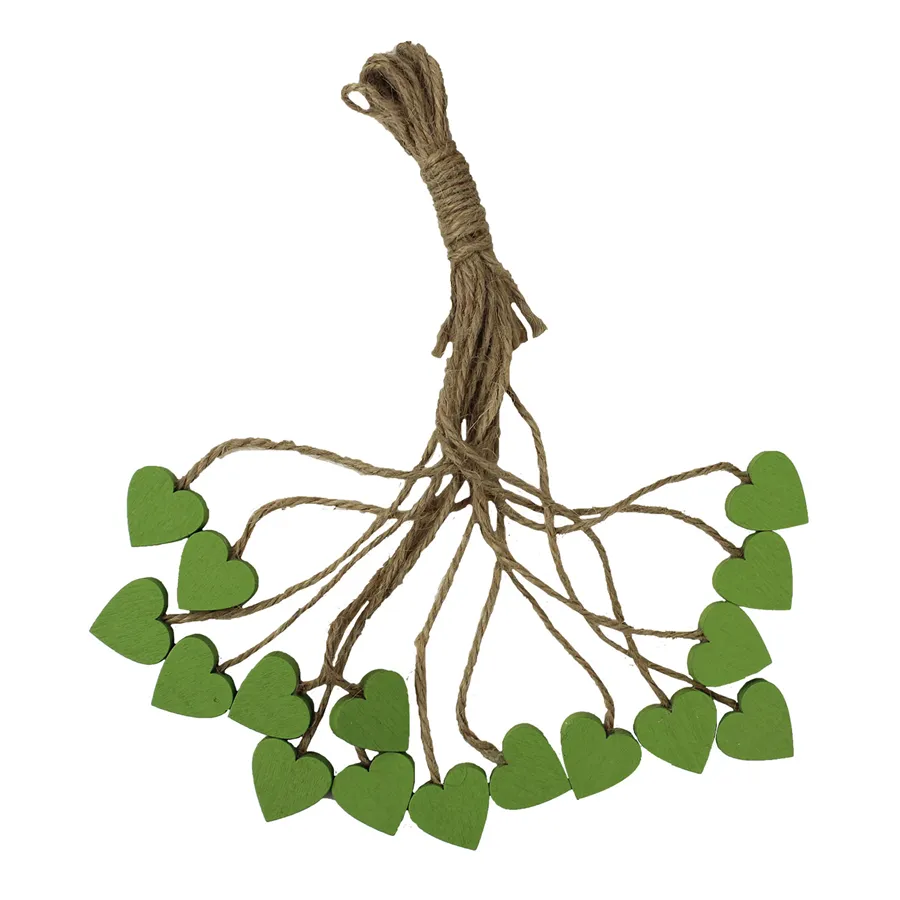 Decorative heart. Set contains 16 pcs. Size: 2,5 x 2,5 cm, total height with string 20 cm. Color: green. Material: wood, natural string.