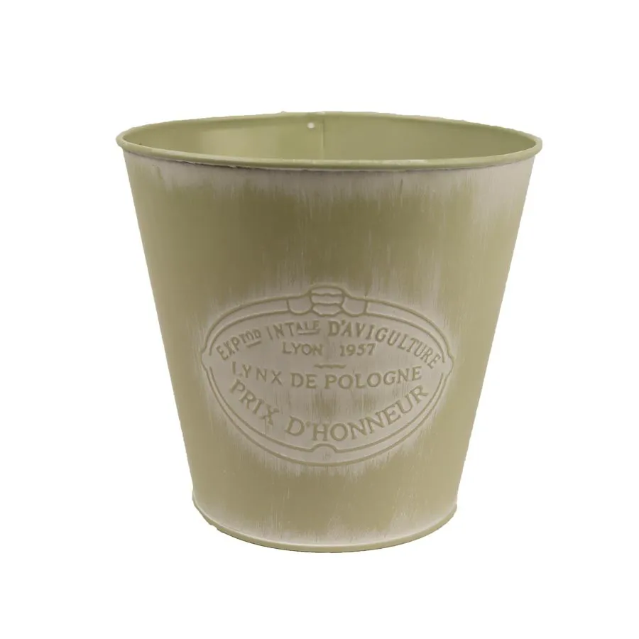 Tin flower pot. Dimensions: diameter 16 cm, height 15 cm. Color: green. Material: sheet metal.