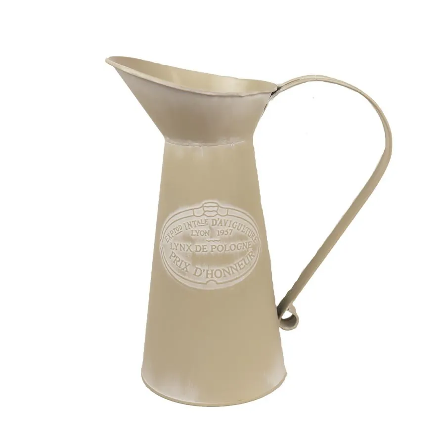 Tin kettle. The teapot is used for decoration, we do not recommend filling with water. Dimensions : 22 x 12 cm, height 27 cm. Colour : beige. Material : metal.