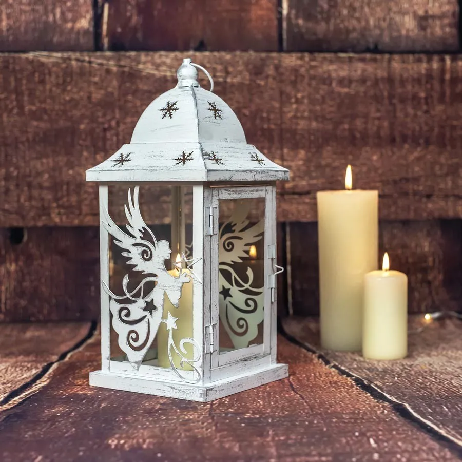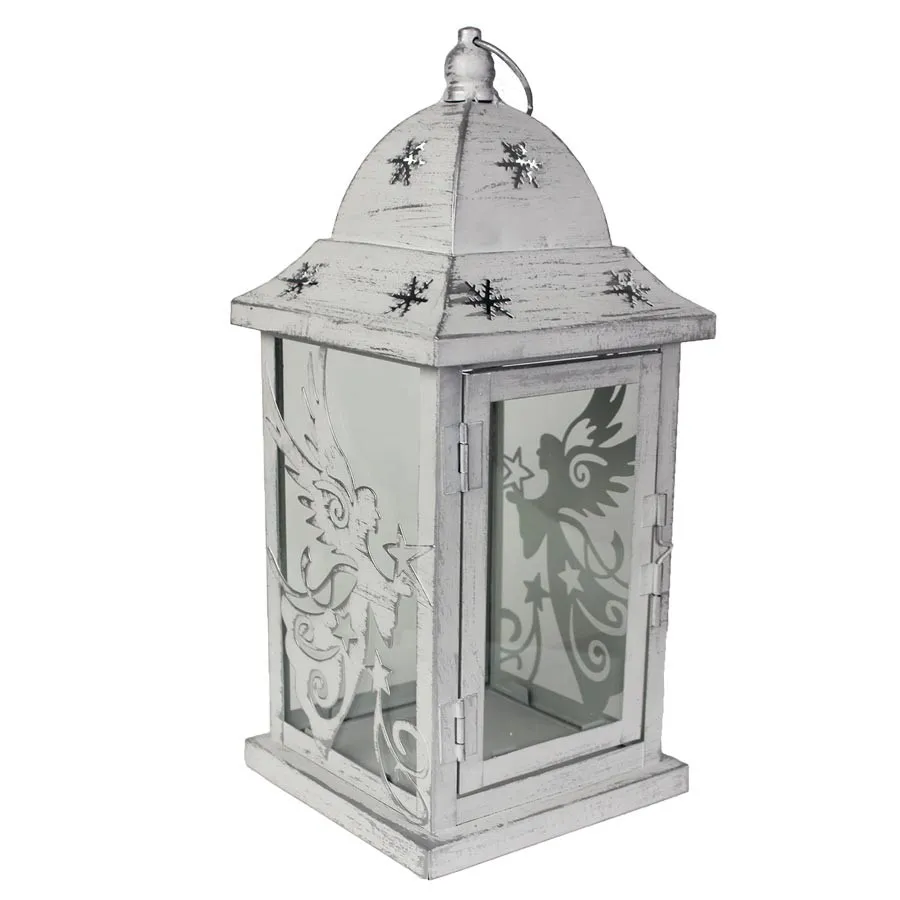 Beautiful metal lantern with angels.Dimensions: 14 x 14 cm, height 32 cm.Color: white.Material: metal, glass.