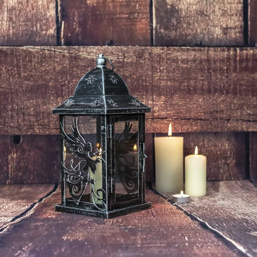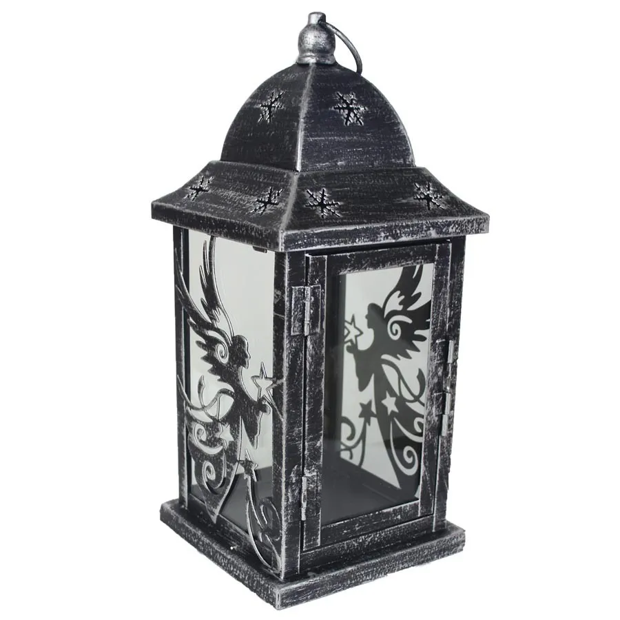 Beautiful metal lantern with angels.Dimensions: 14 x 14 cm, height 32 cm.Color: black,Material: metal, glass.