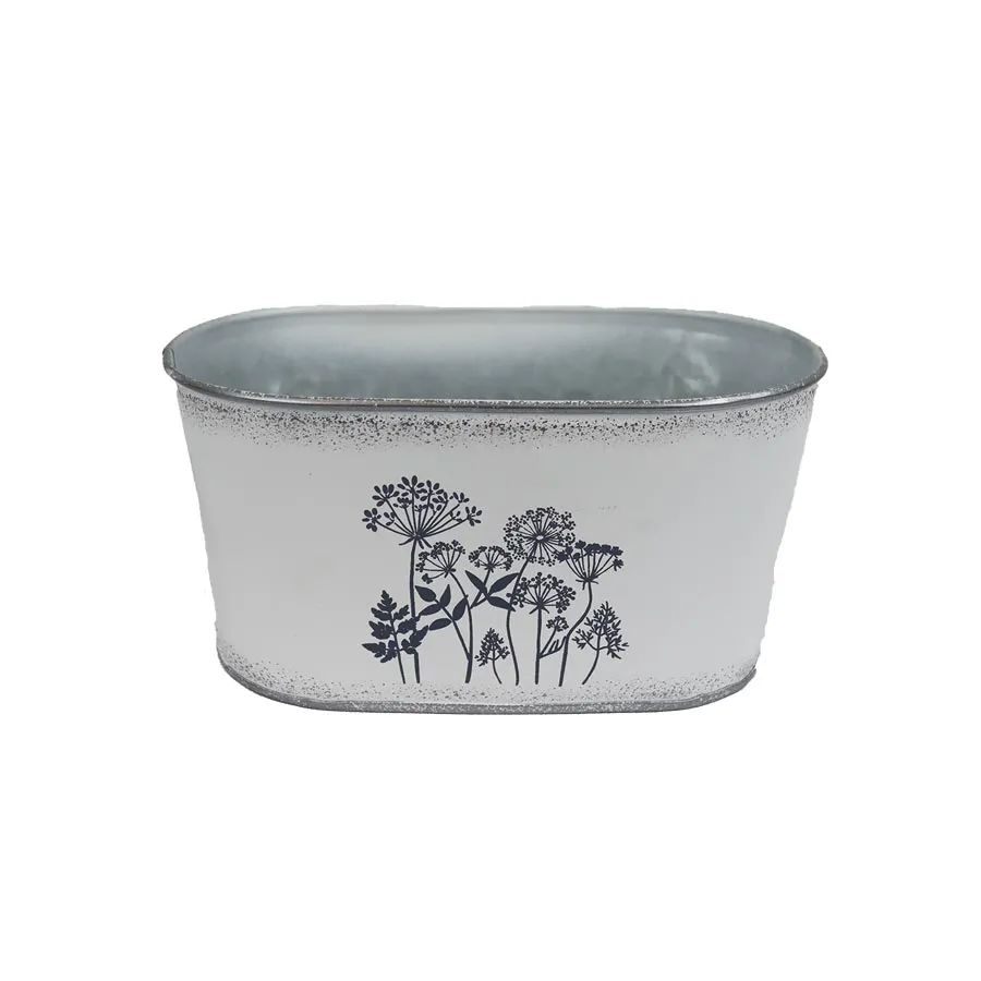 Oval tin flower pot.