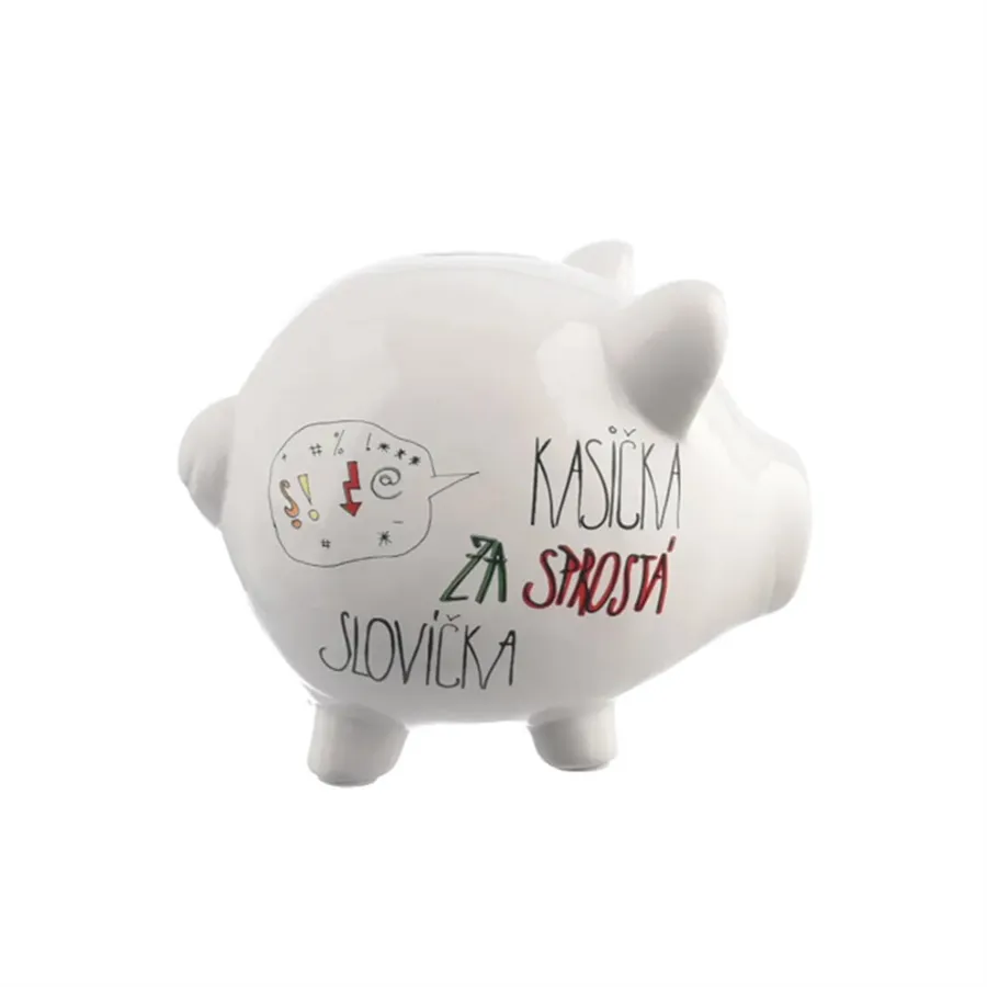 White ceramic piggy bank in the shape of a piglet with the inscription "Swear Jar".