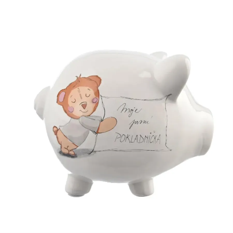 White ceramic piggy bank in the shape of a piglet with the inscription "My First Piggy Bank".