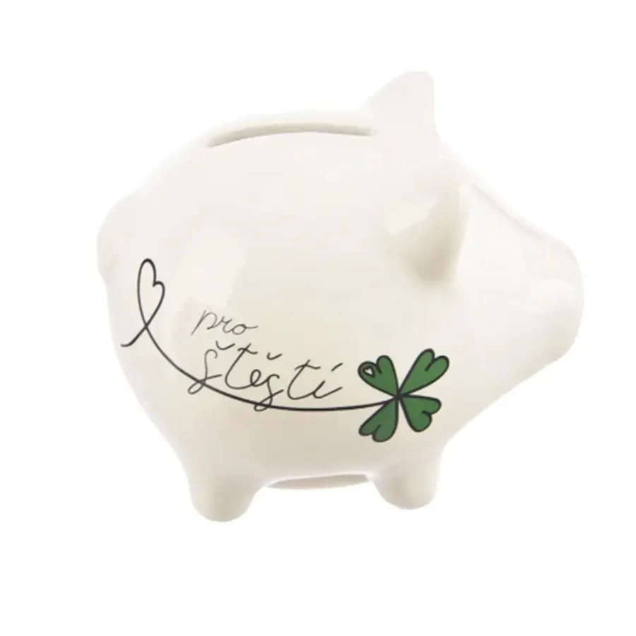 White ceramic piggy bank in the shape of a piglet with the inscription "For Luck".