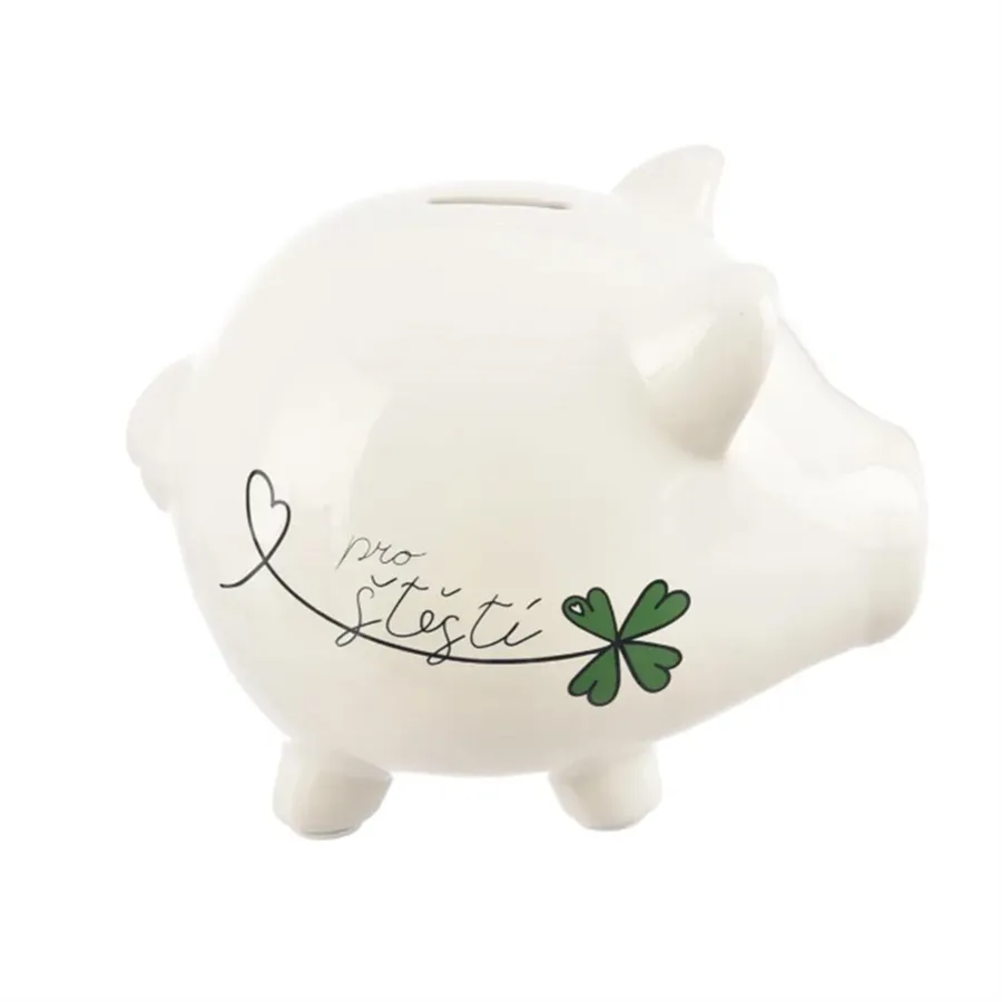 White ceramic piggy bank in the shape of a piglet with the inscription "For Luck".