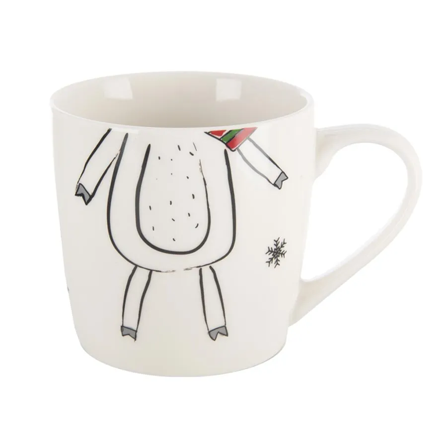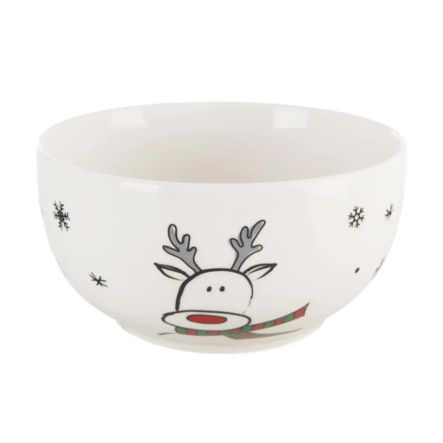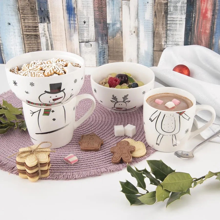 The porcelain mug with reindeer decor is complemented by a bowl that is part of the decor.