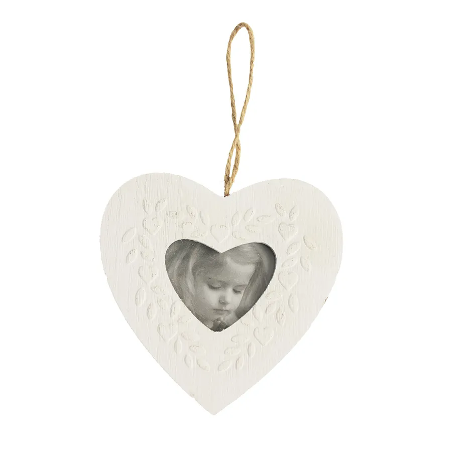 Photo frame heart for one photo. Size: 10 x 10 cm, a thickness of 1 cm. Photo size 5 x 4.5 cm. Color: white. Material: wood, glass, string.