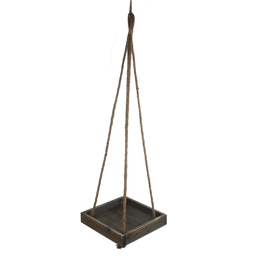 Flower hanger. Dimensions: 23 x 23 cm, height 4 cm, total length with hinge 75 cm. Grey color. Wood-based material, string.