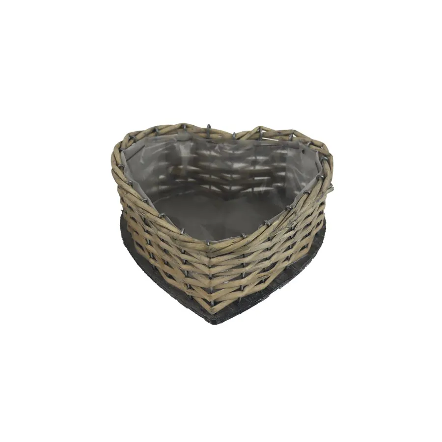 Decorative heart planter with plastic lining. Dimensions : 21 x 21 cm, height 7 cm. Colour : grey. Material : wicker, plastic.