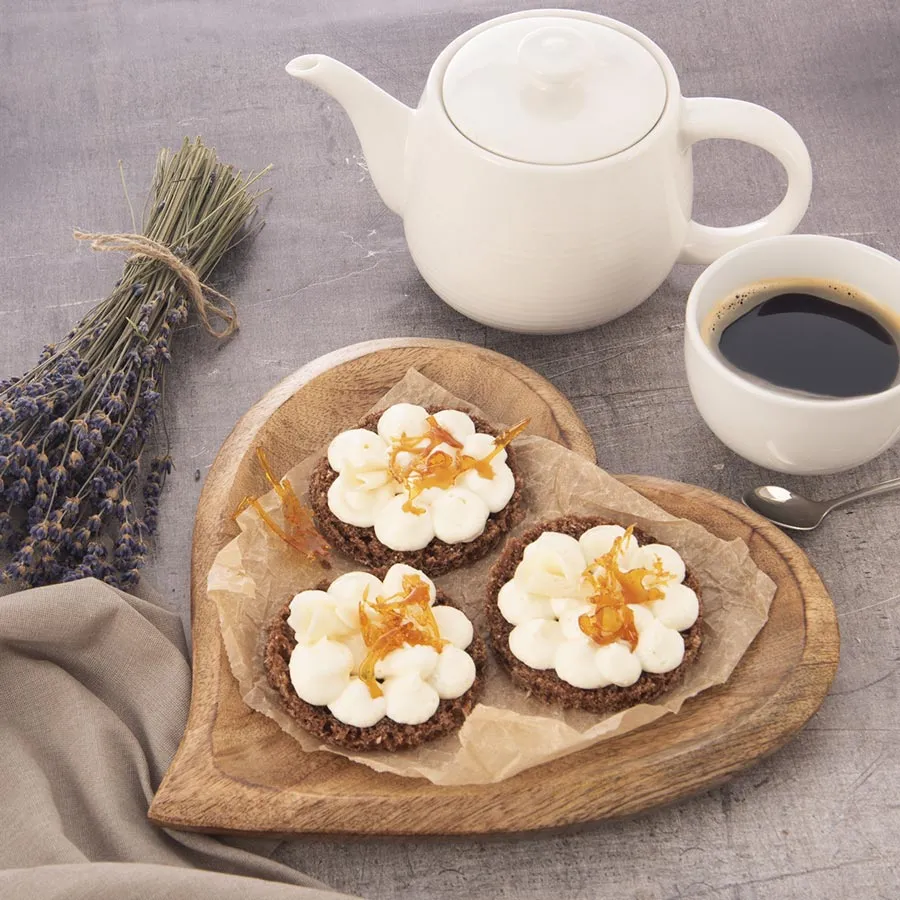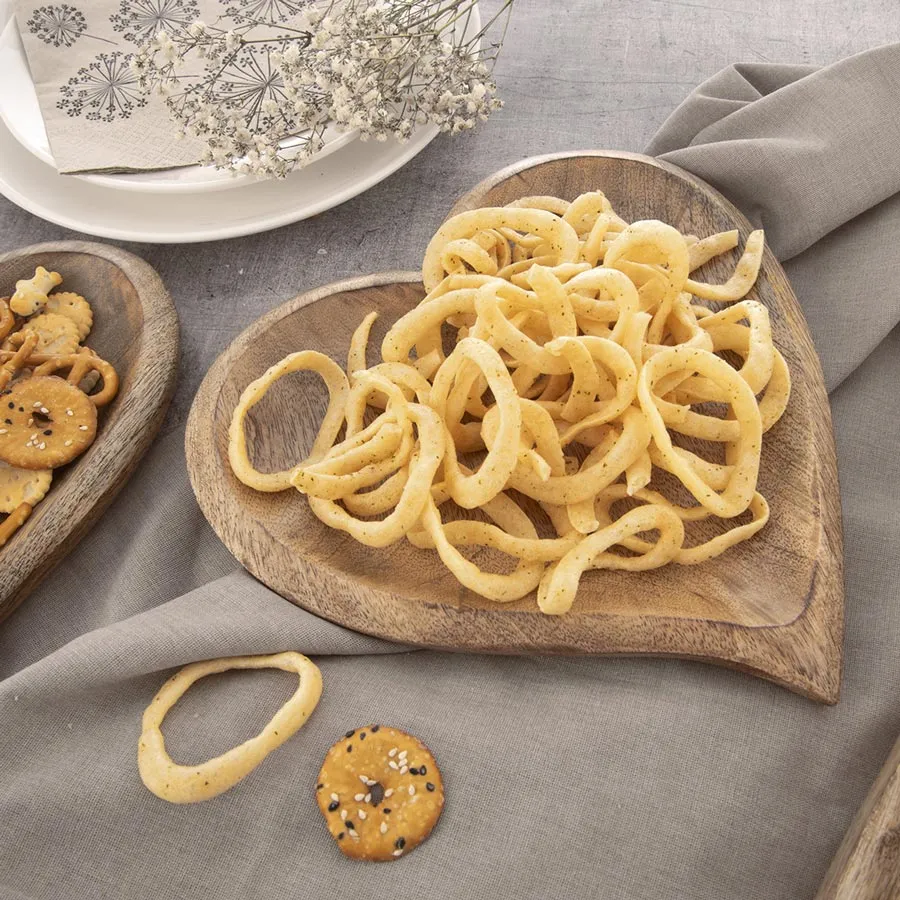 Serving tray made of natural material in the shape of a heart.