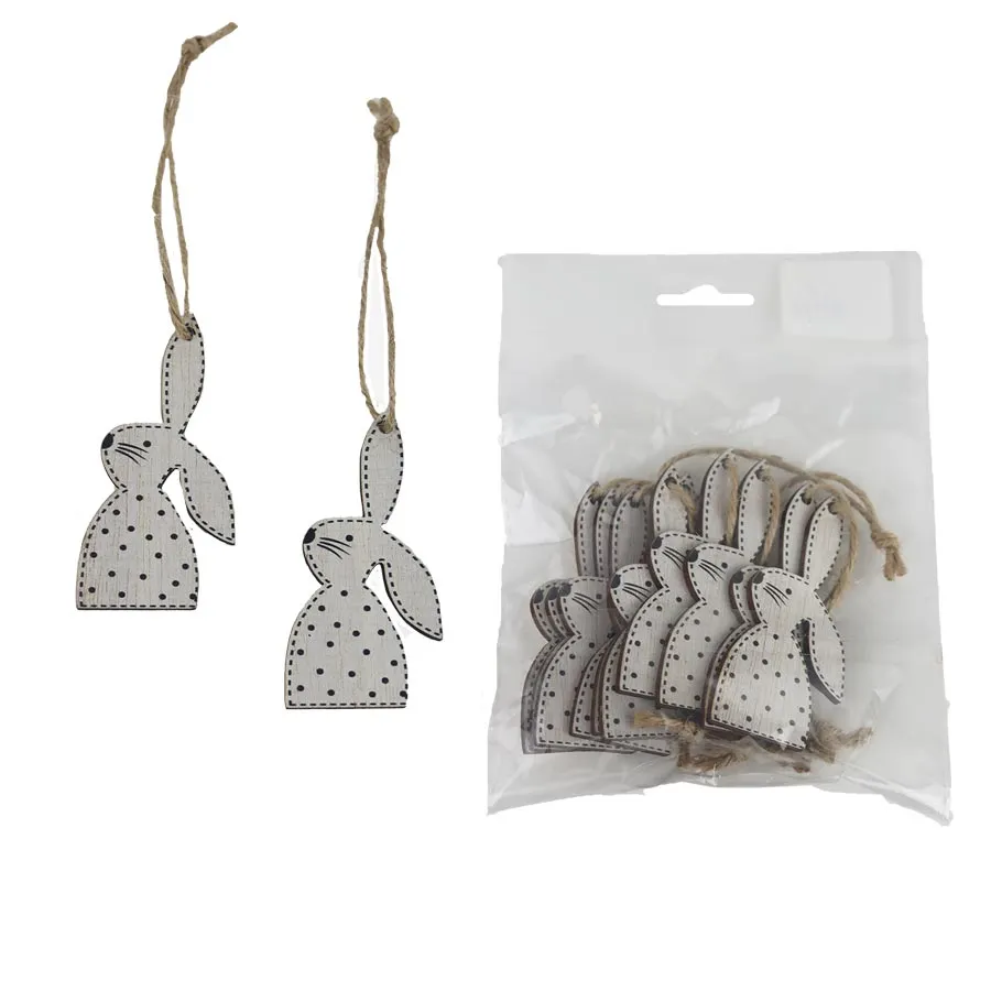 Set of decorative bunnies for hanging. The set contains 10 bunnies. Dimensions: White color. Wood-based material.