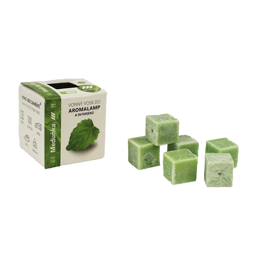 Scented wax - MEDUŇKA T. The box measures 4 x 4 x 4 cm. The box contains 8 cubes of wax measuring 1.5 x 1.5 x 1.5 cm. You can use the wax in electric aroma lamps as well as in tea candle aroma lamps. You can also use the wax indoors - wherever you put the wax, it smells there.