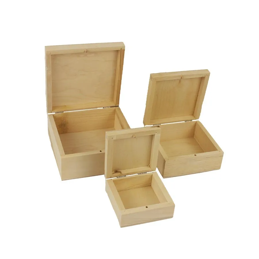 Set of wooden boxes. The set contains three boxes of three sizes. The smallest box has dimensions: 10 x 10 cm, height 4.7 cm. The small box has dimensions: 13 x 13 cm, height 6 cm. The middle box has dimensions: 16 x 16 cm, height 7.5 cm. Color: natural. Wood-based material.
