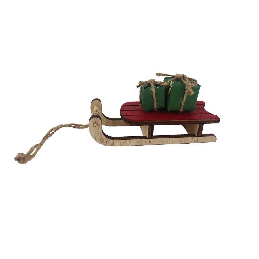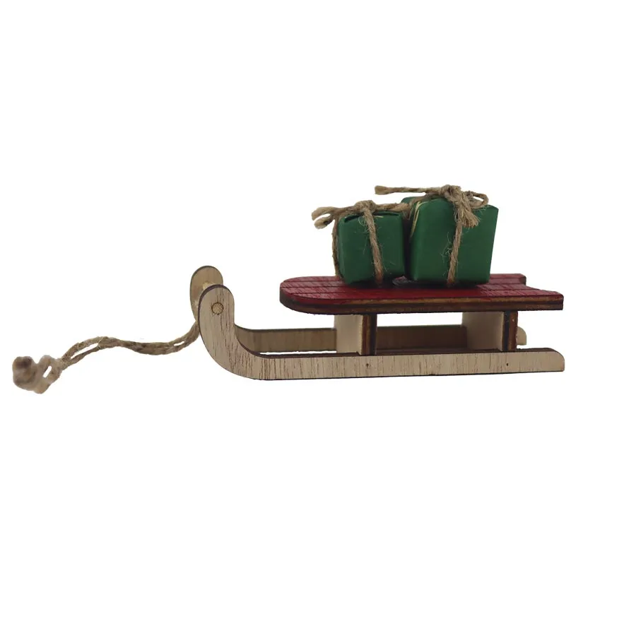 Decorative sledges for hanging with gifts.