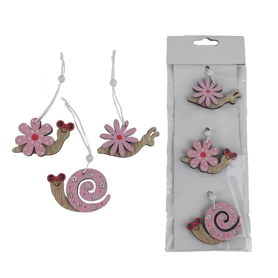 Set of decorative snails. Set includes 3 snails. Dimensions: 6.7 x 0.6 cm, height 4 - 4.5 cm. Color: combination natural, pink. Wood-based material.