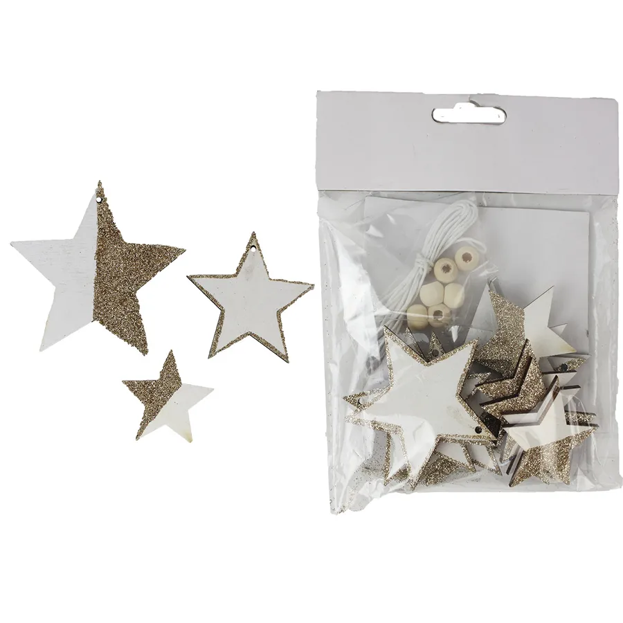 Set contains 12 pcs. Stars are in 3 sizes. Set contains strings and beads. Color: combination white and champagne. Material: alternative to wood.