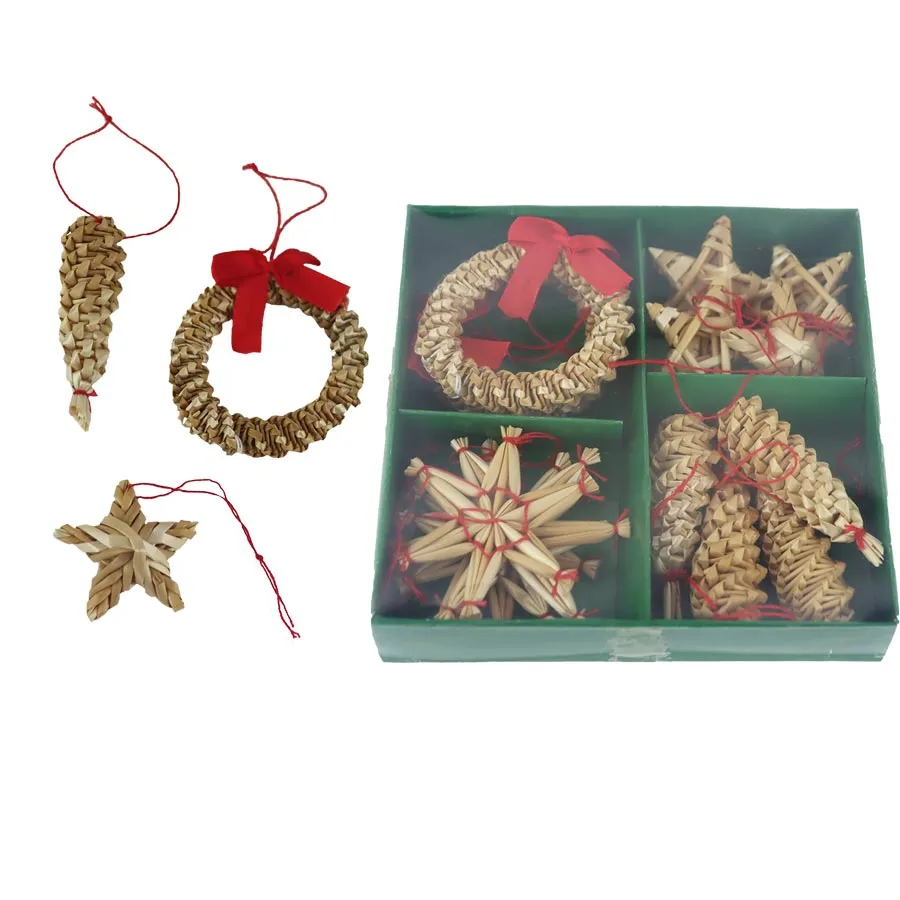 A set of straw ornaments for hanging. The set contains 14 ornaments to hang.