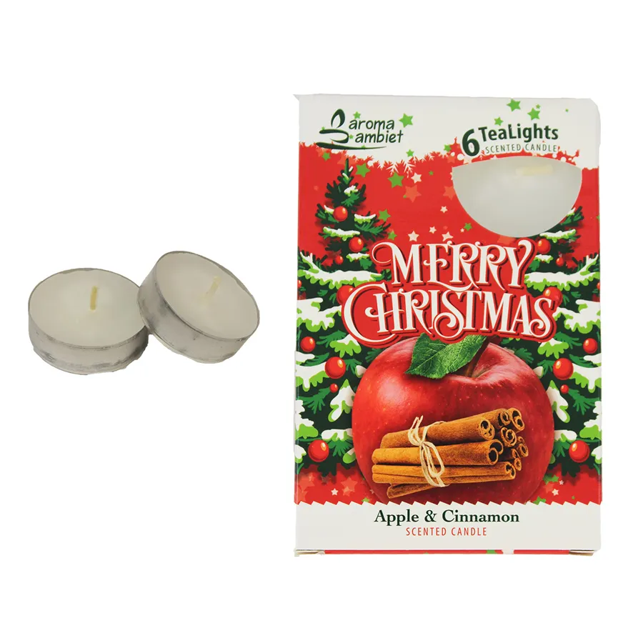 Aromatic tea candle - MERRY CHRISTMAS. The box contains 6 candles. The candle has a diameter of 3.7 cm, a height of 1.8 cm. A candle with a pleasant scent will make your apartment smell great. Burning time is approx. 4 hours.