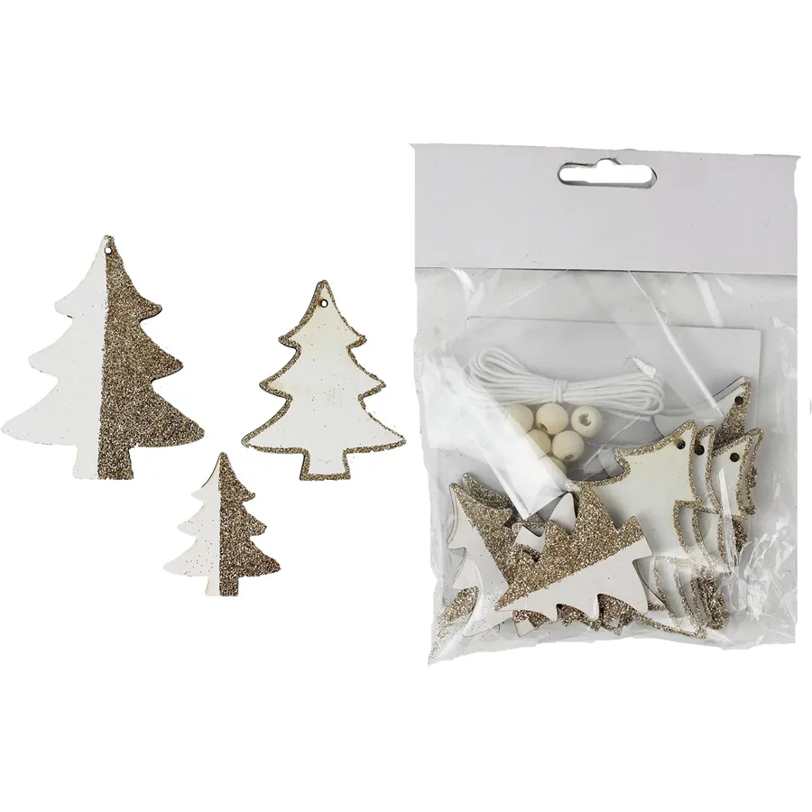 Set contains 12 pcs. Trees are in 3 sizes. Set contains strings and beads. Color: combination white and champagne. Material: alternative to wood.