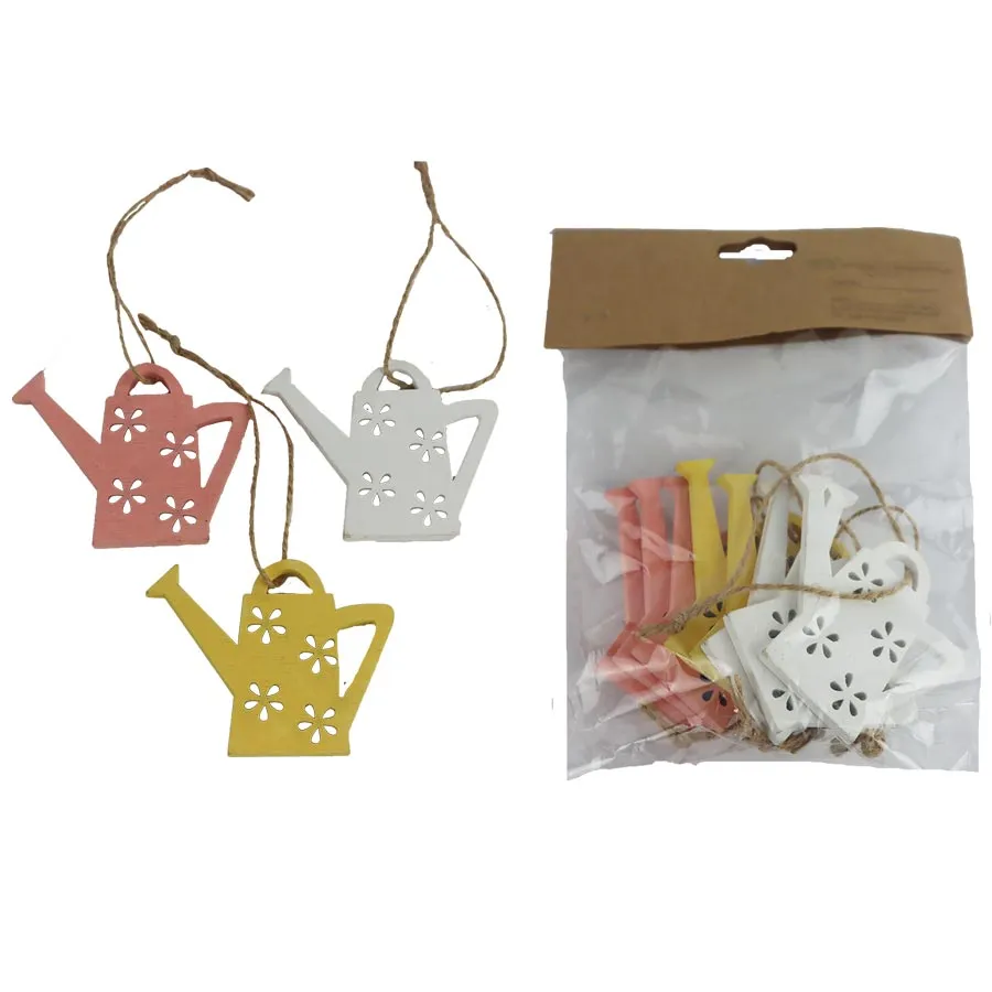 Set of decorative teapots for hanging. The set contains 8 teapots. Dimensions: 7 x 0.5 cm, height 5.5 cm. Color: combination of white, pink, yellow, natural. Wood-based material.