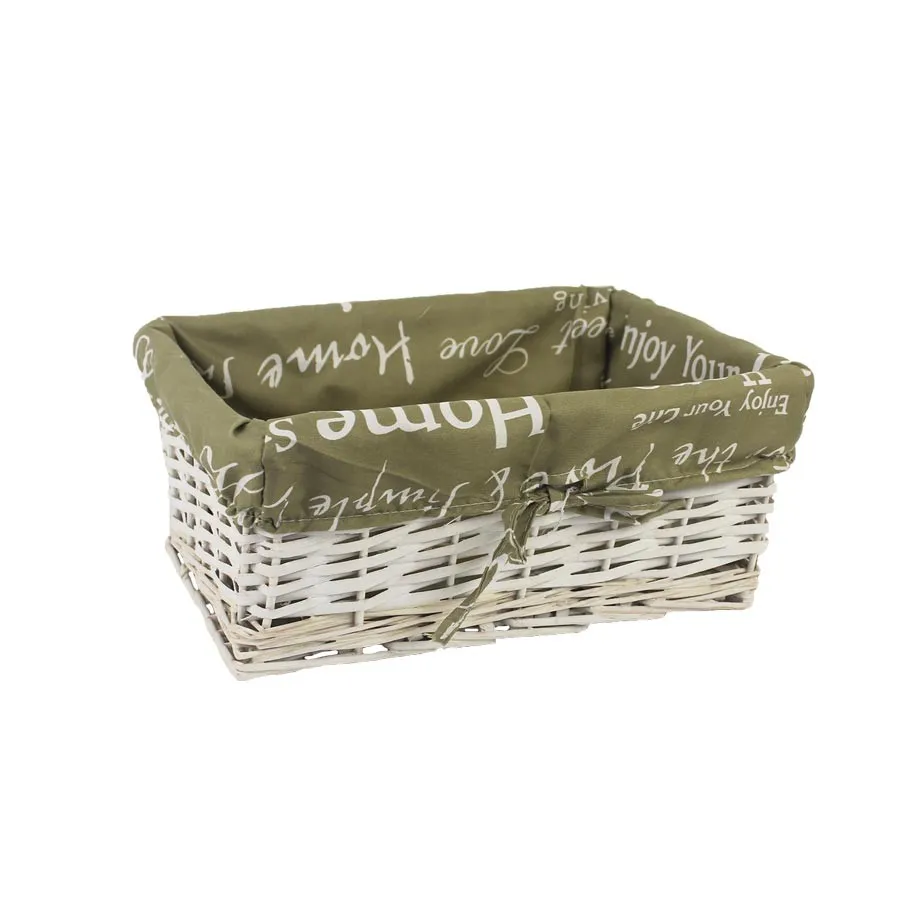 Wicker storage box with fabric - large. Size: 40 x 29 cm, height 16 cm. Color: white, fabric - grey. Material: wicker, fabric.
