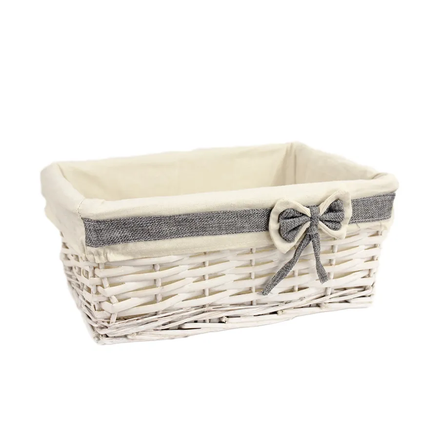 White basket with fabric small. Dimensions: Please note all dimensions are approximate, the baskets are all handmade and therefore unique. The dimensions given are an indication of the approximate size, also the color may little vary slightly. Variance of size +-2 cm.