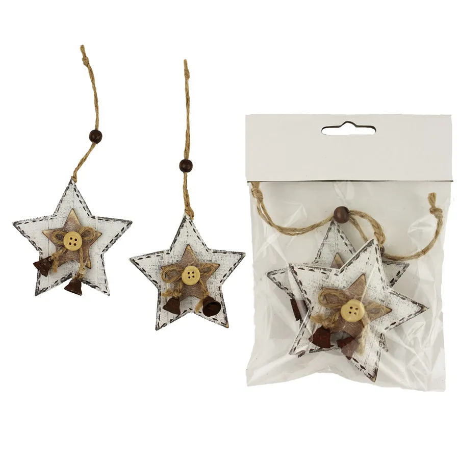 Hanging stars. Package contains 2 pcs. Size: dia 7,5 cm, thickness 0,5 cm. Material: wood.