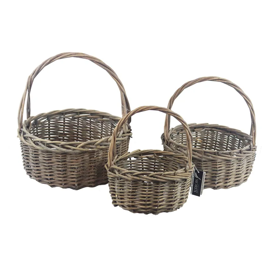 Set of wicker baskets. Set contains 3 baskets in 3 sizes. The small basket has dimensions : diameter 19 cm, height 9 cm, total height with handle 22 cm. The medium basket has dimensions : diameter 21 cm, height 10 cm, total height with handle 27 cm. The large basket has dimensions : diameter 25 cm, height 12 cm, total height with handle 31 cm. Colour : grey. Material : wicker.