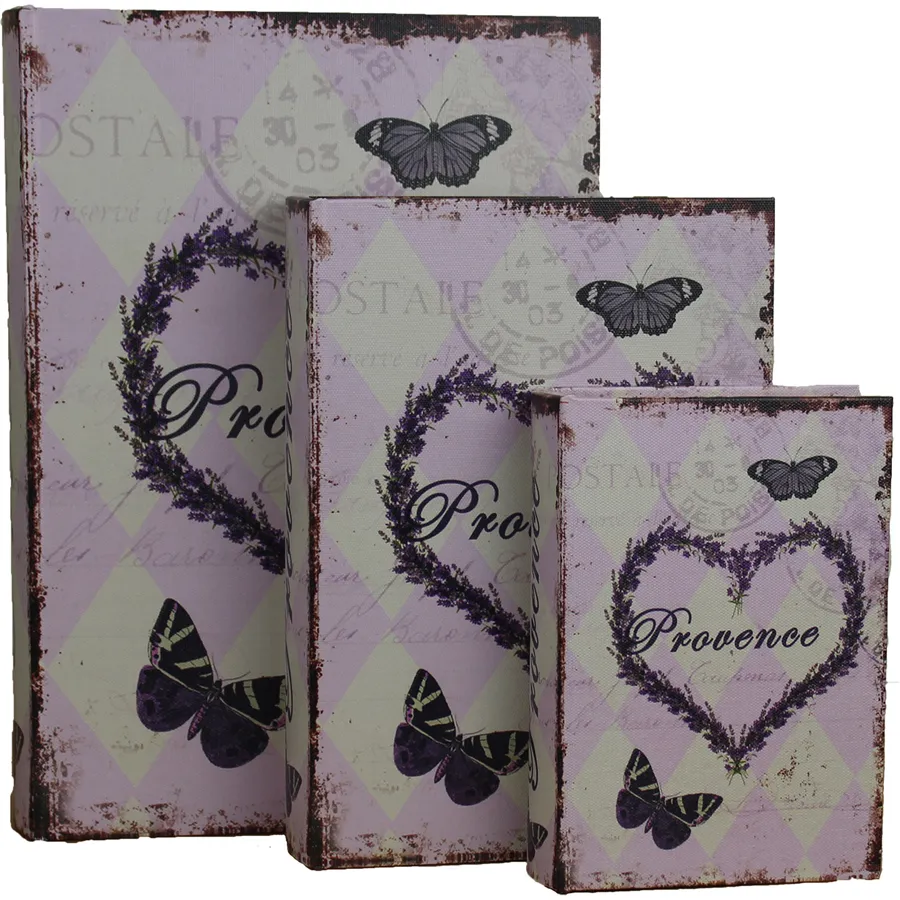 Beautiful wooden set of books, with lavender motif. This set contains 3 wooden books. Small: 13 x 4 cm, height 18 cm. Medium: 18 x 5.5 cm, height 25 cm. Large: 23 x 7 cm, height 32 cm. Material: MDF, cloth.