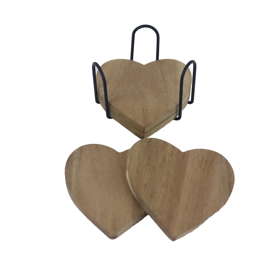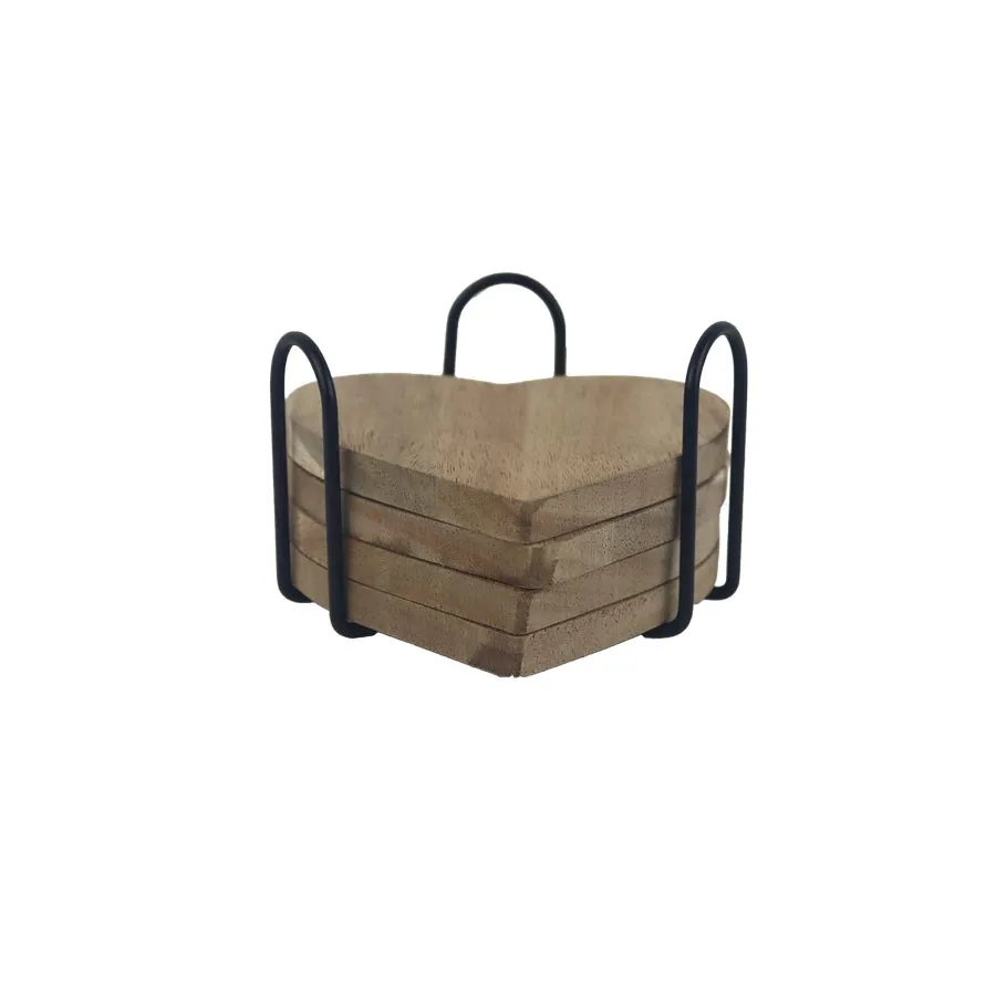 A set of wooden coasters. The set includes 4 coasters, a metal stand.