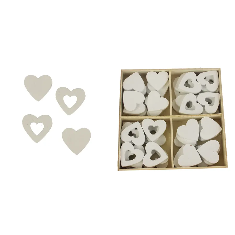 Set- hearts Contains 48 pcs. Size: width 2,8 cm, thickness 0,4 cm, height 2,8 cm. Color: white. Material: wood.