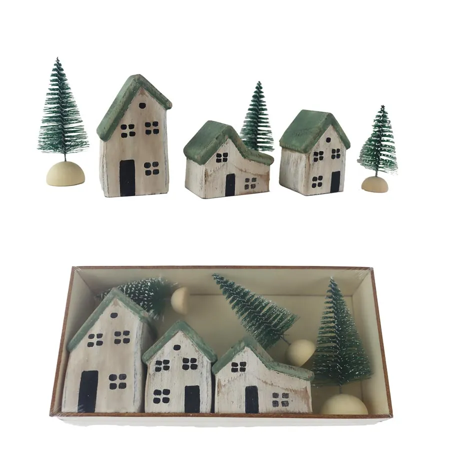Decorative wooden village in a box. The box contains 3 houses, 3 trees.