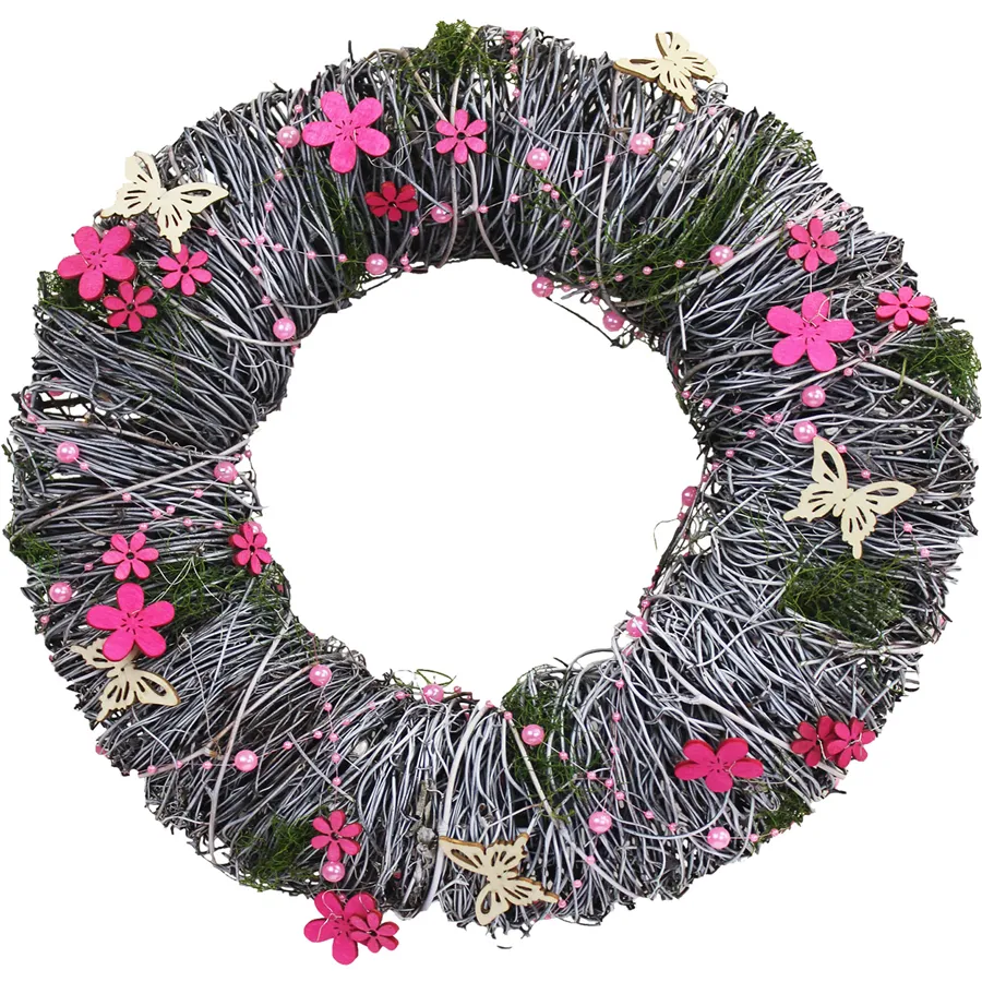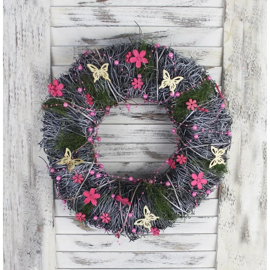Beautiful spring wreath with decorations. Size: dia 34 cm, thickness 8 cm. Material: natural + decorations.